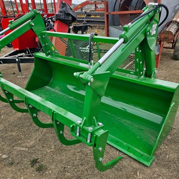 Like new John Deere 8' bucket with 5 tine grapple. Global mounts JD quick connect.